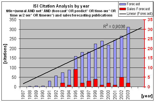 Fig.1: ISI citation analysis on neural networks for forecasting by year However, significant differences exist in modelling suitable architectures for business forecasting for each domains, depending on the forecasting objective, application and dataset. Firstly, a variety of ANN publications focus on nominal predictions for classification tasks, which induce different modelling heuristics of little use to derive point predictions through the metric predictions necessary for sales forecasting. In addition, sales forecasting often implies noisy time series with only a few years of monthly or weekly observations, due to structural breaks from launches, relaunches, new product introductions, listing and delistings etc. as opposed to long time series with a high signal-to-noise ratio often found in engineering, physics or artificial time series. As specific heuristics have been developed for distinct applications, we limit our analysis to publications to the sub-domain of sales forecasting, in order to derive robust recommendations for valid and reliable experiments. As a keyword search does not allow a valid separation of publications, we manually evaluated and eliminated all publications related to non-business and non-sales applications and nominal predictions or classifications, e.g. of marketing response rates, market shares, index prices, electrical load forecasting etc. and different application domains in order to derive homogeneous recommendations. We identified additional studies through a bottom-up follow up of citations and additional searches by author name and research group identified in IEEE Xlpore, ScienceDirect, Citeseer, Proquest and ABI/Inform. Our search yielded a total of 171 publications on time series or causal point predictions in business forecasting, in the categories of general publications on point predictions including examples from business, sales, marketing, production and finance.