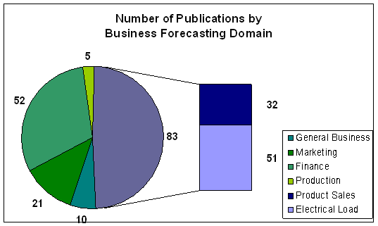 Fig.2: Distribution of Publications in the Business Forecasting Domain In the domain of sales forecasting, only 32 publications focussed on sales forecasting of discrete products or services instead of electrical load forecasting etc. This limited number of publications dedicated to the use of ANN in business forecasting for demand planning verifies previous studies and explains the large attention the sparse publications in the field receive. For example, the International Journal of Forecasting ranked publications on NN as the second and fourth most requested papers in 2001 and 2002 .