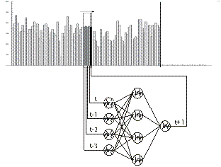 A network architecture is displayed in figure 1, showing Neural Network application to time series forecasting with a (4-4-1) MLP, using n=4 input neurons for observations in t, t-1, t-2, t-3, four hidden units, one output neuron for time period t+1 and two layers of 20 trainable weights. [23].
